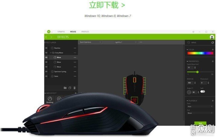 在CHROMA STUDIO可以添加多种灯光效果,如:呼吸效果、响应效果、光谱效果、静态效果和波浪效果等。同时还可以设置灯光属性和灯光持续时间等。