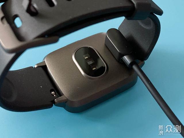 手表的底部中间是心率测量装置,可以看见有椭圆形的玻璃和里面。边上有四个金属触点,无疑是用来充电的,这种样子一看就是磁吸式充电。