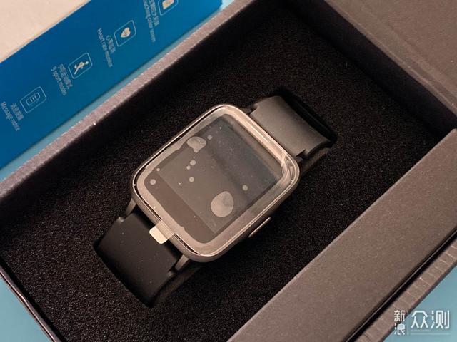 打开盒子,里面看见了智能手表,上面有个出厂贴膜,这个饿,是方形的。
