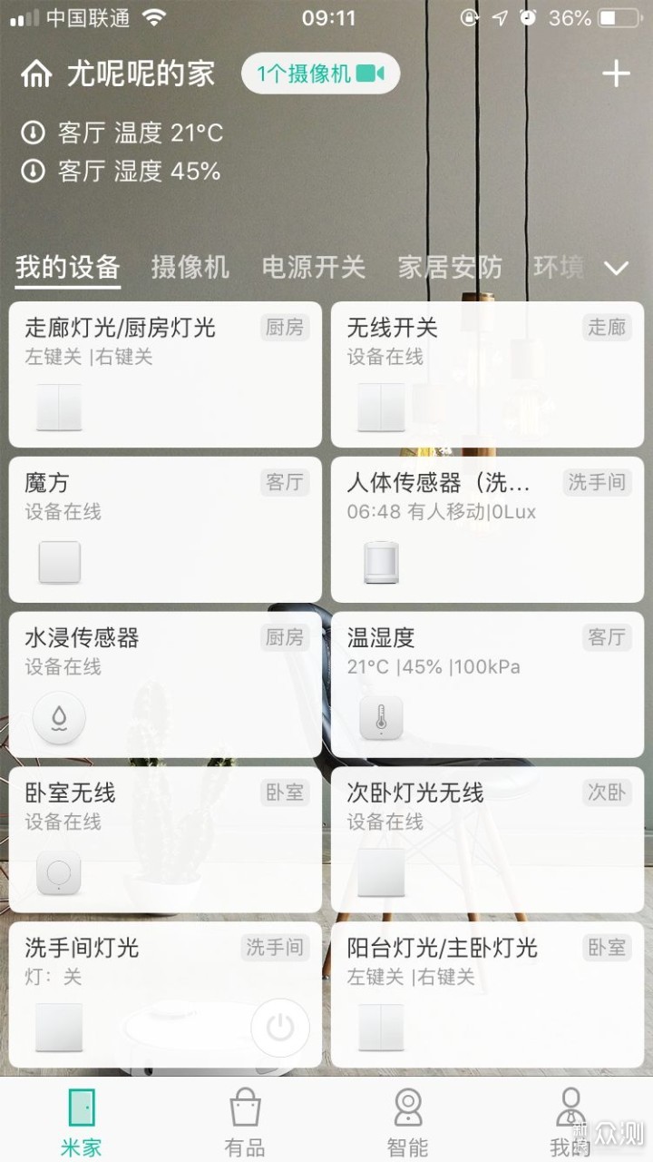 通过门窗传感器,可以感应门窗的开合状态,并且联动灯光的控制或者摄像头的控制。但是因为我打算后期安装米家的指纹锁,这样联动效果更好而且开门亮灯或者关灯的设定感觉只适合单身使用,所以也没安装。 肆、可接入App:米家App:最常用的小米智能电器控制App,可以控制大多数的小米智能电器,可以直接在这个App里看见家中所有的小米智能电器,使用起来也是比较方便的,能一目了然的看见设备目前状态。这里就不赘述了,下一篇打造智能联动再详细写。