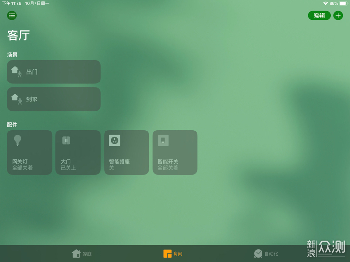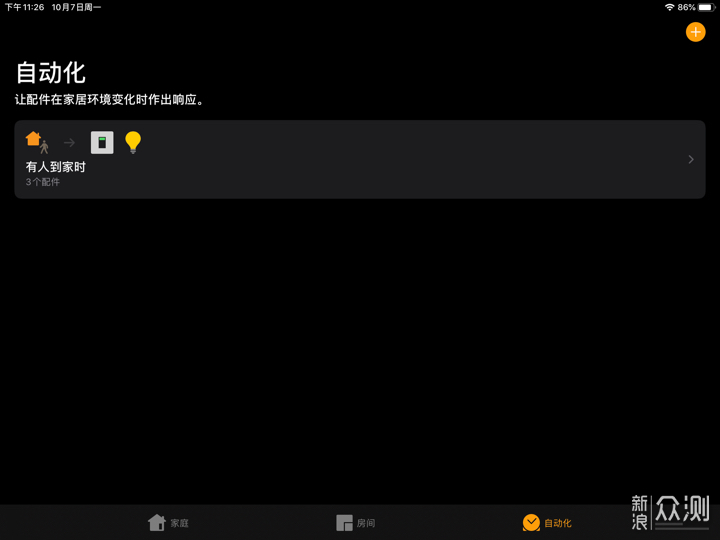 HomeKit App包含了家庭、房间、自动化三个板块。其中家庭板块中包含了所有的场景以及添加的HomeKit设备,可以看到上文的通过米家App添加的设备已经全部显示在家庭板块中.