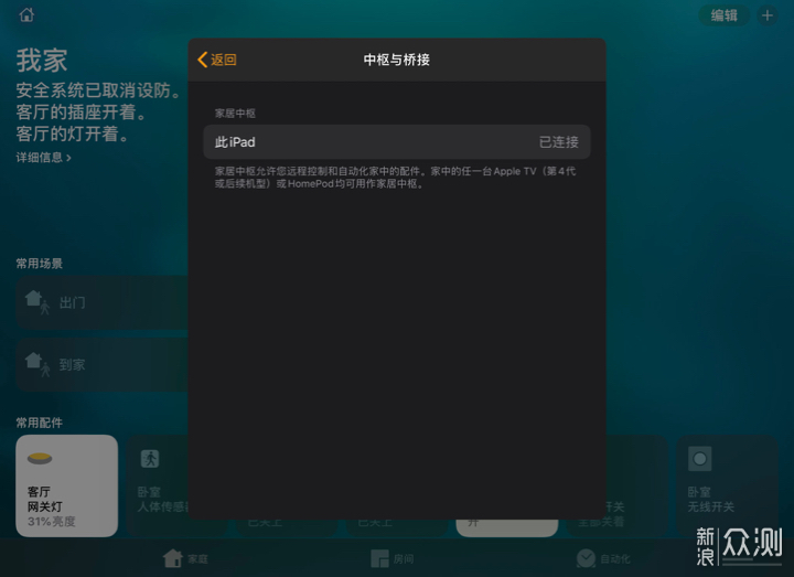 需要注意的是,自动化场景以及远程控制必须要要设置一个中枢设备,这里楼主用了一个闲置在家的iPad作为中枢。其原理就是通过iPad本身连接各个HomeKit设备,如果用户不在家中也想操作设备,就会通过iCloud发送命令至iPad进行远程控制。除了iPad,家中的iPhone、Apple TV以及HomePod都可以作为中枢。