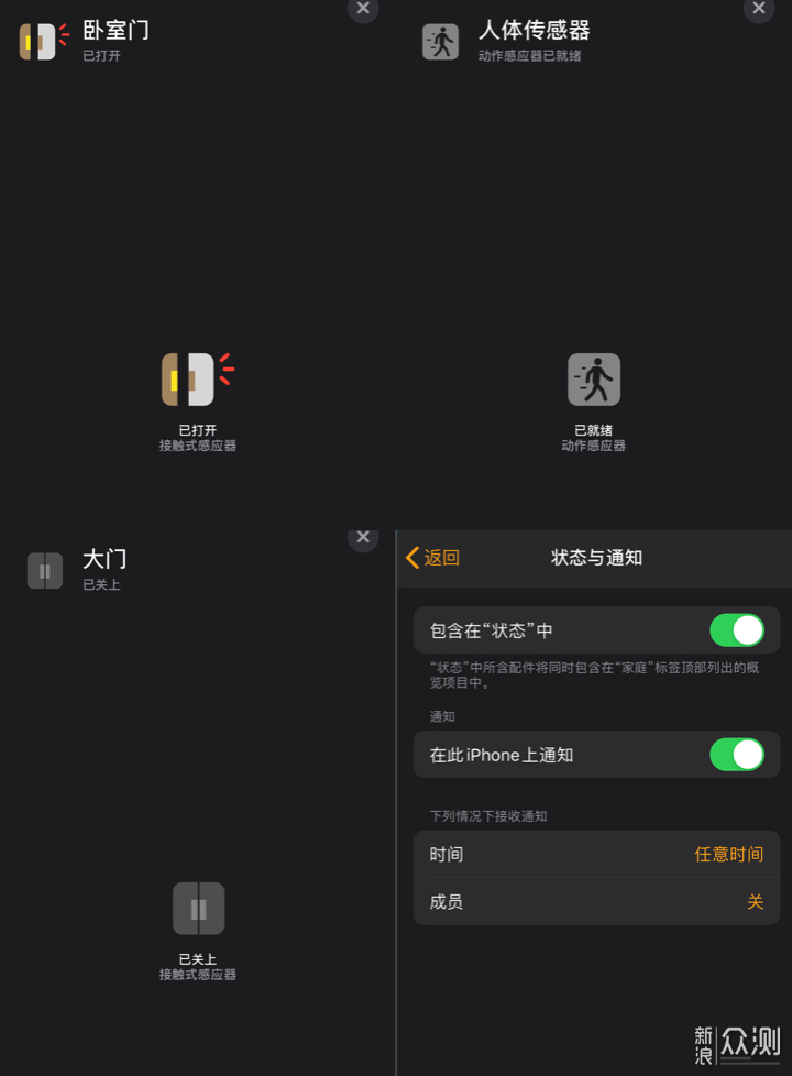 HomeKit设备交互体验Apple的原生应用交互体验一向简单易用,HomeKit应用自然也不例外。部分子设备由于是传感器,只能用于查看状态并不能进行实际操作;当然其中可以设置,当传感器状态发生改变的时候推送到用户手机。