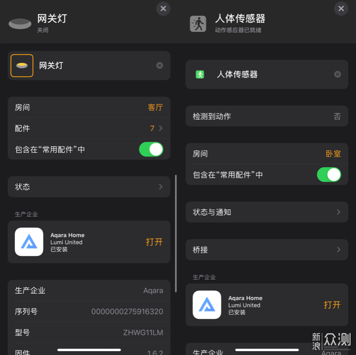 更多自动化场景 此外还有通过门窗传感器来进行的自动化场景,比如晚上开门自动开灯;早上出门以后自动开启网关警戒模式;家中每人的时候人体感应器检测到有物体移动立即发出警报以及推送给用户手机 使用总结以上为大家介绍了HomeKit的实际使用过程,以及一些自动化场景案例的设置。最后也和大家谈谈HomeKit的使用体验。正如文章开头所说,楼主本身是一个米家智能设备深度用户,这里也会穿插对比。 App打开速度 毫无疑问HomeKit作为原生应用,亲儿子打开速度自然是很快,但有时候人在外面需要iCloud联网更新设备状态,需要一小会等待时间;而米家App每次打开都会有启动页面,如果长时间不使用一些硬件,进入到控制界面还需要加载过程。说实话若是没必要,楼主是非常不愿意进入到米家App进行硬件控制的,当然米家提供了iOS小组件可以快捷控制值算是一个解决方案。 App功能 由于HomeKit的硬件数量还比较少,很多硬件仅仅是支持开关操作,就比如网关的夜灯在HomeKit中调节颜色还需要选取颜色,而在米家App中则是1600W色无极切换,可能苹果认为用户不需要这些花哨的功能,但是楼主作为用户并不买账 语音控制 HomeKit的优势在于可以通过多种设备的Siri来进入语音控制,不受时间地点的约束,但是智障Siri识别率本身就不高,有时候还会出现设备无法响应的情况,使用体验非常糟糕;而米家App主要受控于小爱智能音箱,关于识别率以及响应速度已经达到了优秀的水平,唯一的缺点就是受限于位置。综合对比楼主还是更倾向于后者。 感谢绿米Aqara,希望可以再接再厉推出更多设备
