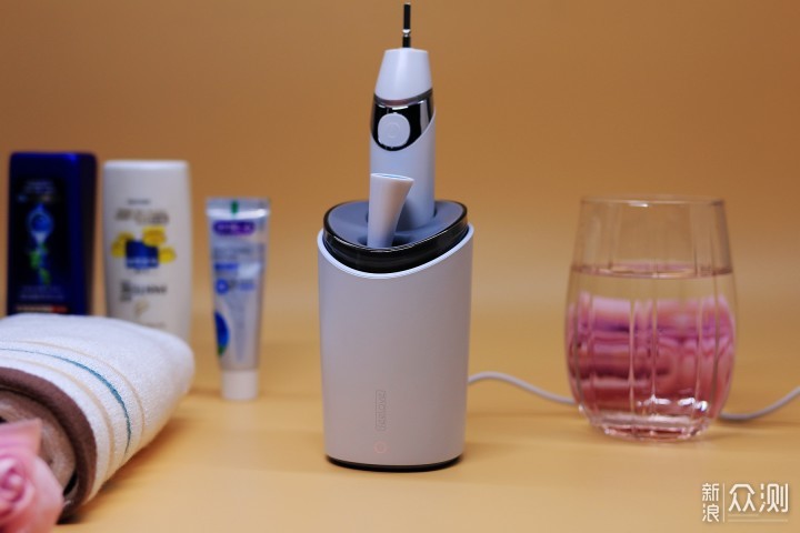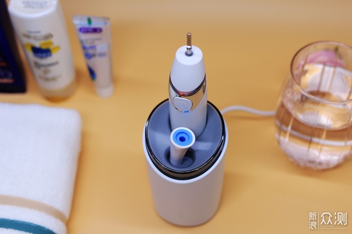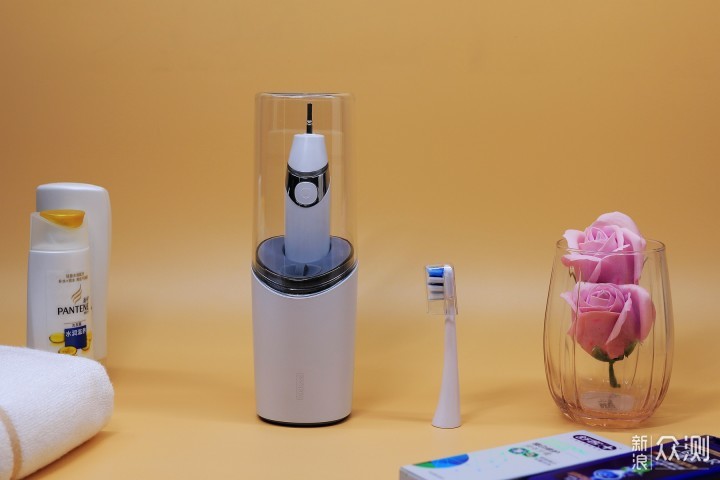 扉乐F1采用了UV紫外线杀菌,当刷头插入杀菌杯时就会自动感应进行杀菌烘干。刷头的杀菌时间为15分钟,烘干时间为30分钟,当完成后,对应功能就会自动关闭,充电底座的指示灯也会由红变为蓝色。如果是出差旅行,也可以将刷头放置在杀菌杯中,这样在携带时也非常方便。不过,要注意充电底座和杯盖连接时要对好,不然放在包里很容易就会脱落。