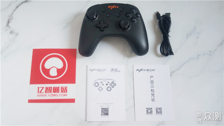那么拿出产品来个大合影,从左往右分别是:莱仕达9607手柄主体、充电数据线、产品说明书,以及产品三包凭证,整体看下来比较简洁。