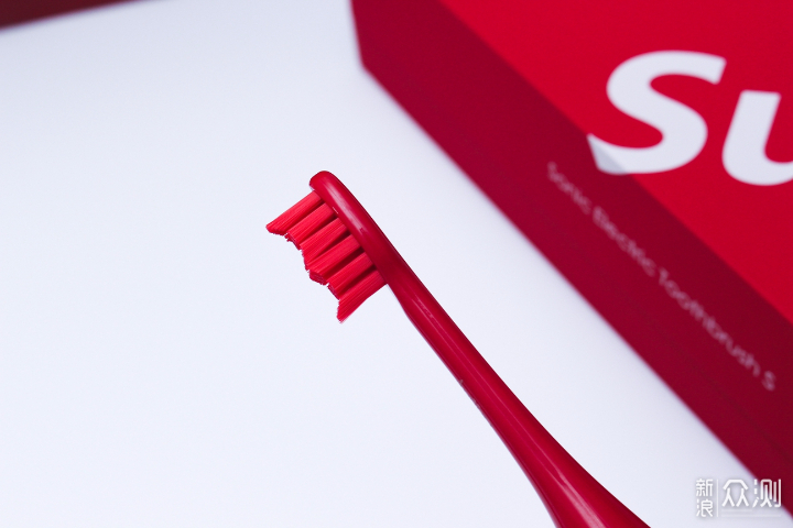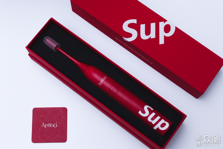 包装内的就是牙刷本体了,同样是红色搭配白色的Sup字样,牙刷四周会有黑色海绵包裹保证牙刷不会被挤压。
