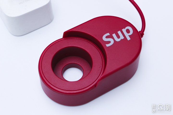 再来看充电底座,底座的红色做到和牙刷本体的统一,放置牙刷的位置是中空的,侧面位置Sup字样依旧很显眼。