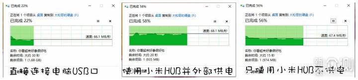 移动硬盘直接连接电脑USB3.0口、使用小米集线器并外部供电进行连接、只使用小米分线器进行连接三种模式下进行了测试,结果发现传输性能基本一致,基本都能维持在65Mb/S。考虑到这款产品支持的数据传输上线是500Mb/S,基本上对于日常使用来说瓶颈就是自己的设备咯。 49元的价格,颜值在线,整体性能表现也OK。倘若对便携USB HUB有需求的话,小米的这款产品不妨考虑下。