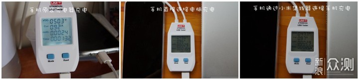 分别使用红米原装快充直接充电/手机连接电脑USB3.0接口/手机通过小米分线器连接电脑USB3.5接口进行测试。由于红米电脑较多,原装线充电进入了涓流模式,三者基本都维持了5V1A的工作状态。产品标称电流为900mA,实测数据略高于标识参数。从测试结果来看,USB分线器对充电性能没有影响,5V1A的水平基本是OK的。