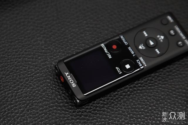 录音笔通体大部分都是黑色为主,正面设计的非常典雅大气,大大的STOP和PAUSE按键似乎还能让我看到以前“滑稽之眼”残存的影子。录音笔上半部分使用的是1.42英寸LCD显示屏,紧挨着SONY LOGO下侧有一个长条且显眼的LED指示灯。屏幕虽然不是彩色的,但是现实功能十分齐全,就像索尼相机一样,显示屏详细显示着录音状态、场景模式、音量指示、播放时常、音频文件存储文件夹和剩余电池电量。看一眼屏幕,关于录音笔的状态一目了然。