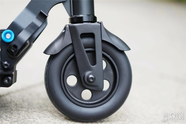 前轮采用了实心橡胶轮胎,轮子直径150左右。前叉部分用料比较扎实,厚度达到了6mm。