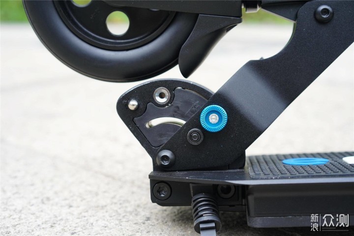 折叠机构同样采用了免拆装的设计,打开锁紧装置后,按压左右两侧的快速拔销,就能快速完成emicro one的折叠,打开的话反向操作就能快速打开,整个过程基本能够在10秒以内完成。