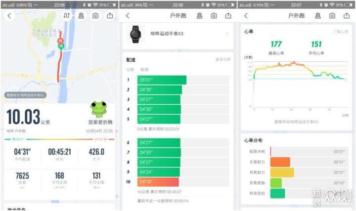 在跑步模式中有显示当前时间、平均配速、当前心率、总路程和时间的数据,还能通过屏幕向右滑动查看实时配速、累计爬升和卡路里,以及运动轨迹等相关数据,与手机同步数据后,还能通过App查看更全面精准的数据信息。