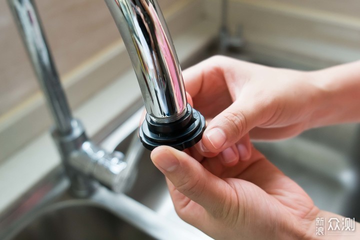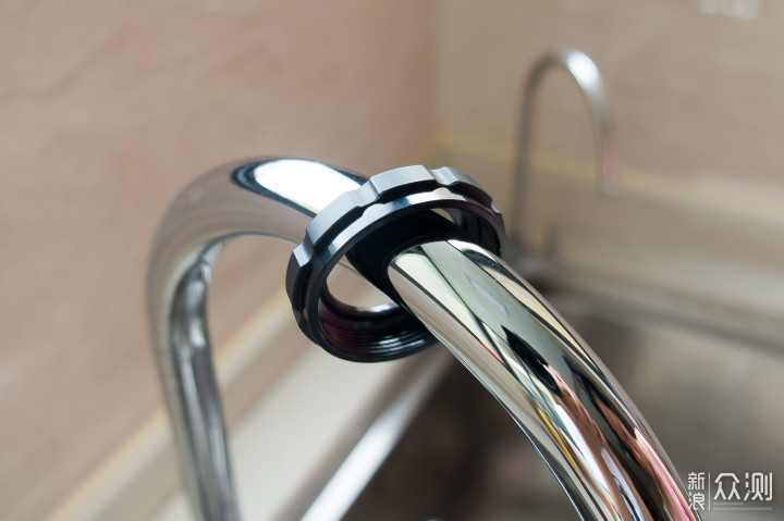 ▲螺纹适配器扭紧至水龙头后,把一目净水器卡入相应位置,再将连接螺母扭紧即可。注意,因为一目净水器上半部分为可控区域,也就是说外壳是可以转动的,所以在扭动时最好是用连接螺母作为发力点,以免弄坏机器结构。