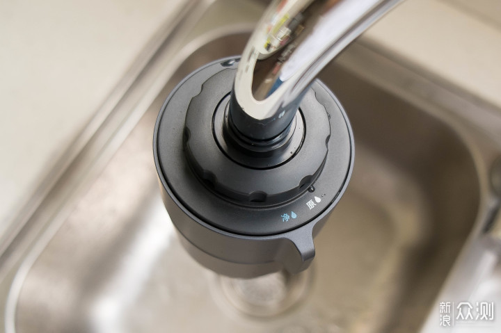 ▲安装完毕后,就可以通过一目净水器顶部的图标提示,通过转动上半部分控制出水是否需要净化了(净为过滤后的水,原则是自来水)。
