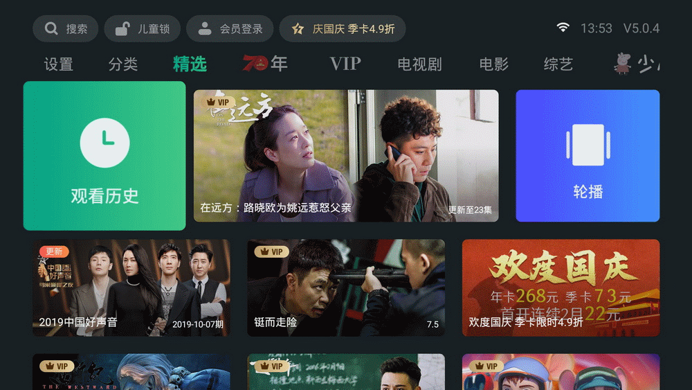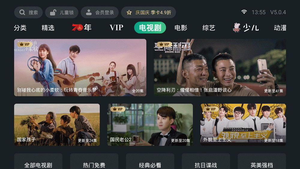 使用泰捷视频App点播视频也非常方便,它对资源进行了详细的分类,包括电视剧、电影、综艺、少儿、动漫、纪录片、游戏、生活和音乐,也另外开辟了VIP和70年的版块,浏览风格依旧是书签式左右切换。