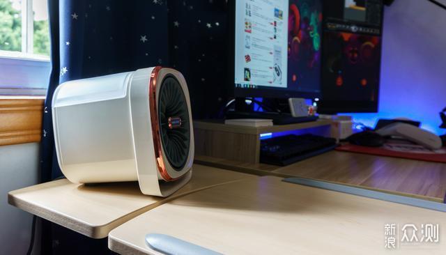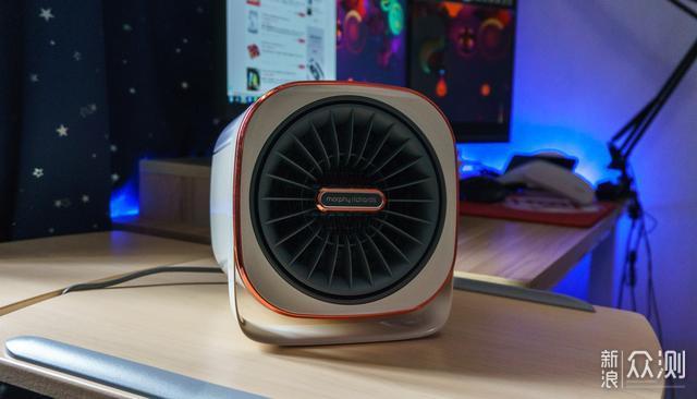 将摩飞冷暖风机往桌上一放,感觉有些萌萌的样子。如果不是正面的morphy richards LOGO与那一圈玫瑰金勾边,我会以为是个LED舞台灯。