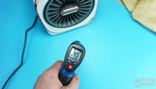 我们使用时自然不可能凑得那么近,那么出风口外的温度如何呢?我们测量了一下10厘米处的温度为42.5℃。