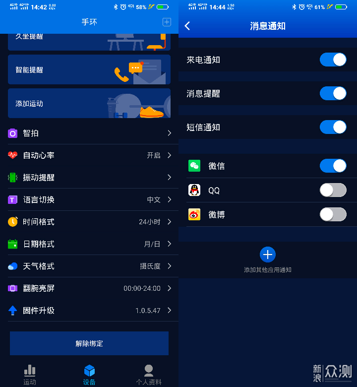 在App可以设置的功能有:智能拍照,自动心率的开启,震动的提醒,还有时间的格式,语言的切换,天气的格式,还有翻外亮屏,这些功能可以说都是非常实用的。其中消息通知,有来电通知、消息提醒和短信提醒,我使用最多的是这个来电通知,有时候开会,手机我设置的是静音,手环会做到及时提醒我手机是否有来电,来电的是谁。