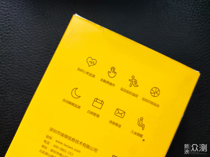 在为黄色的外包装盒上面标注有实时心率监测,全触屏操作,运动实时追踪,久坐提醒日程管理消息推送,自动识别运动,自动睡眠监测等功能。