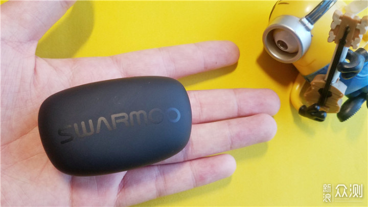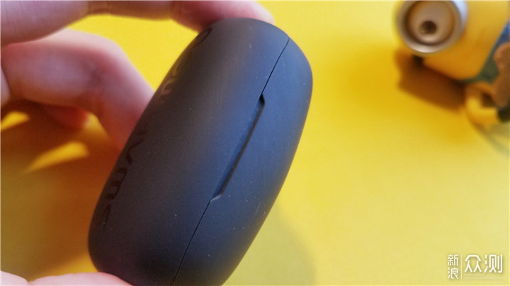 小哞充电仓的表面经过磨砂处理,手感温和而细腻,外形是比较特别的椭圆结构,充满逼格的英文标志,让本来单调的正面显得些许活力,尺寸是67.8x41.85x29.64mm,和同类型的产品相比,小哞充电仓在尺寸控制上算是比较优秀的。