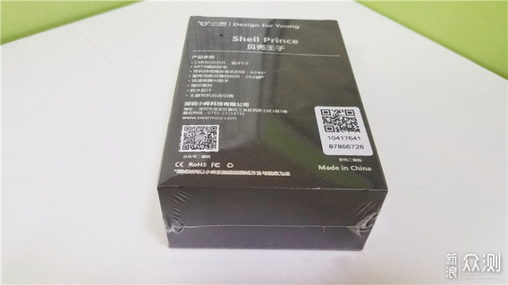 小哞的外包装从外及内比较简单,包装盒背面印刷有产品的详细参数,其中这款蓝牙耳机使用的是CSR3020蓝牙芯片、蓝牙5.0技术,以及APTX无损编码标准,在更低的延迟下,传输更高音频信号。