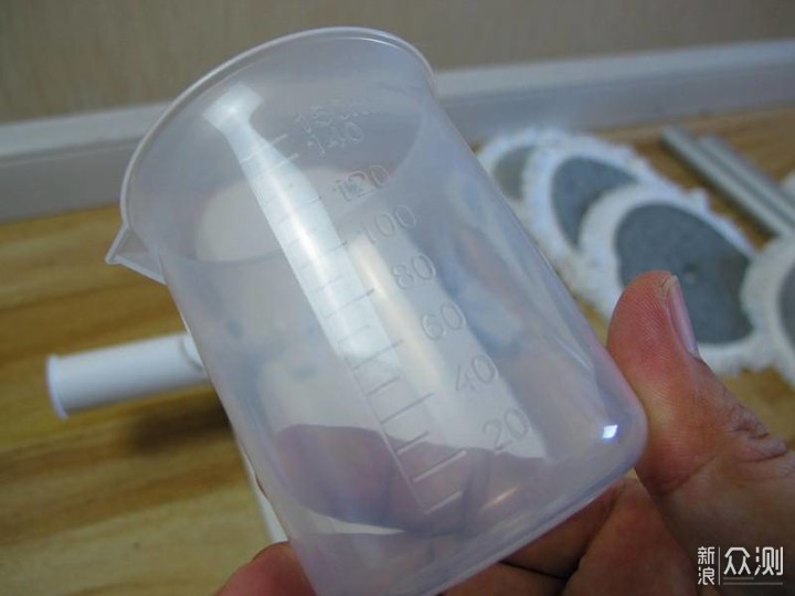 西加加CC MOP无线旋转擦地机自带一个量水杯,透明材质,杯壁上带有刻度线,可以方便的控制加水量。
