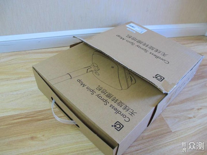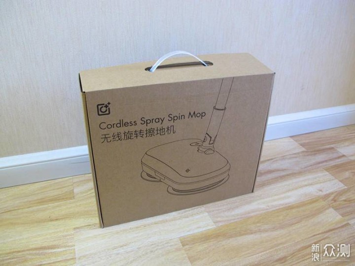取出内部的包装盒,这一个带有提手的包装,方便携带,正面是简化版的擦地机图案以及中英文的产品名称:无线旋转擦地机,让人一目了然。