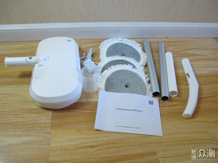 取出包装箱内的所有配件,包括了擦地机主机、擦地拖布X4、说明书、延长杆X4,以及量水杯和充电器,配件比较齐全。 『外观颜值』