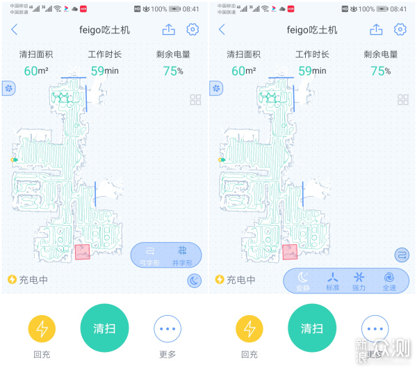 App中规定的清理方式,是弓字形清理,还是井字形清扫,都可以选择,弓字形清理更快,适合轻度灰尘的家庭,井字形对于同一面积清理两次,适合处女座的家庭用户。