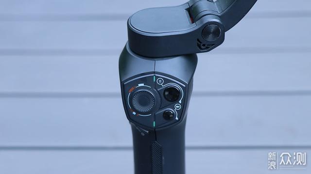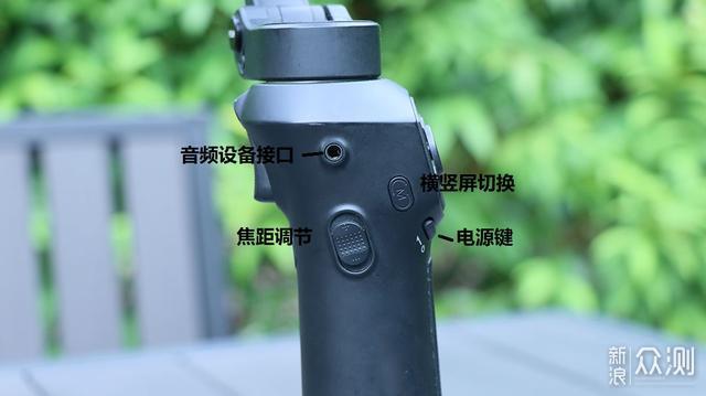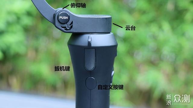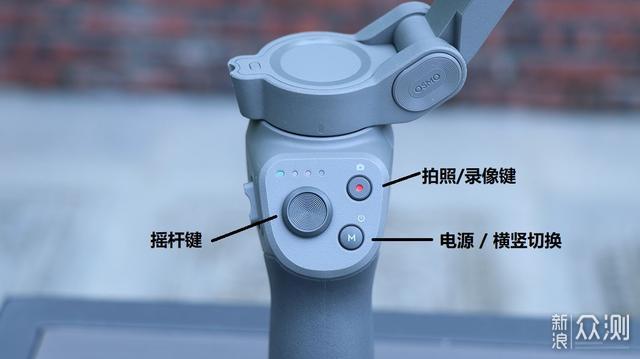 操作按键有三,分别是控制云台方向的摇杆、红色的拍照/录像键,以及功能键M,多功能包括长按开关机、单按看电量、双击切换横竖屏、三击休眠。