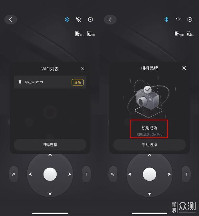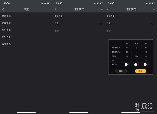 这样的操作界面还是第一次遇到,与之前的Smooth 4变化不小,可以通过手机控制稳定器的上下左右移动,以及各种模式的切换。遗憾的是,App中无法调节云台的跟随模式,只能在云台上通过M键来进行调节。