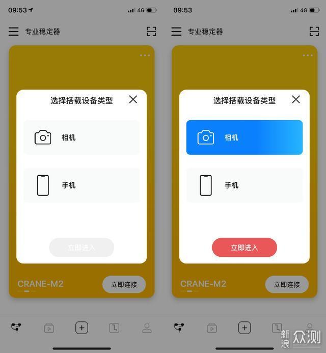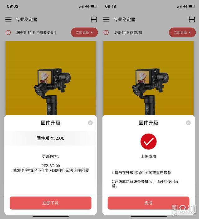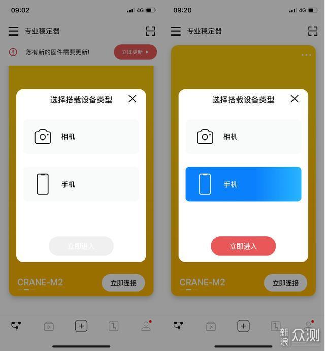 不同于其它设备,云鹤M2既支持手机也支持相机,所以会有手机和相机两种不同的界面,用户可以根据自己的需求进行选择。不过,在此之前,建议用户先更新下固件,官方优化了多种功能,需要5分钟左右的时间。