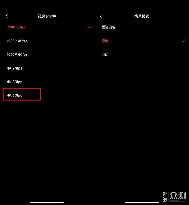 在视频分辨率方面,最大 支持4K 60fps,完全可以满足不同用户的需求,一般来说1080P就足够了。在情景模式方面,可以选择跟随设备、行走、运动,选择合适的模式有助于拍摄出更清晰的画面,默认是行走模式。