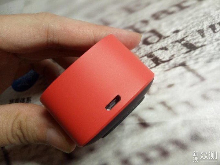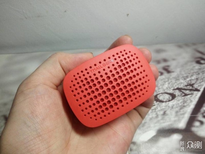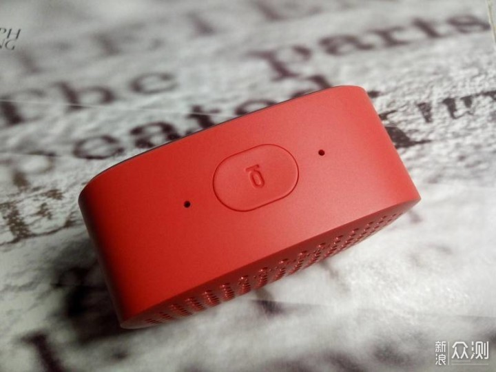 智能蓝牙音箱以纯红色,外观小巧精致,可轻松握在手上,有着不错的便携性。智能音箱见过不少,但这样小巧的还是第一次见。整体尺寸为68x48x32mm,重量为79g,既小巧又轻便,放置家中办公桌上几乎不占什么空间,还能轻松放入口袋,外出携带方便。