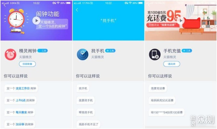 还有一些小技能,能定闹钟、找手机、充话费等,工作之余可以通过与天猫精灵BOOM聊聊放松一下。 三、总结天猫精灵BOOM智能蓝牙音箱外观小巧轻便,手感舒适,既能放在家中,又能外出携带,不仅提供有很多好玩有趣的功能,还能关联智能家电,通过AI语音交互轻松玩转,工作之余与其唠嗑一下还是不错的。 不足:户外使用续航有待提升;每次要通过按压语音键唤醒,有些不便。