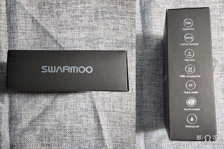 开箱耳机外包装看上去有些简单,外层是黑色软纸包装(用软包真的好吗?感觉保护措施不够),包装盒正面印有银色的“小哞”LOGO和产品型号“Shell Prince”;背面上方同样印有“小哞”LOGO,另外标有“Design for young”(为年轻人设计),看得出产品准确定位人群,接着下面是产品名称、产品参数、产品公司名称、公司地址、官方网址、公众号二维码、防伪二维码等信息;左面标注品牌名称SWARMOO;右面标有该产品的配置和功能(这里是用英文标准的,如果能用中英双语标注就更好了)。