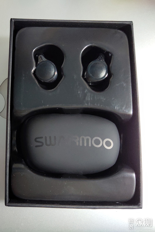 打开外层盒子,就可以看到里层的耳机和充电仓,耳机和充电仓均为黑色,分开放置于黑色塑料盒相应位置,内包装采用塑料材质,显得廉价粗糙,如能换用海绵类缓冲保护材质则更好。