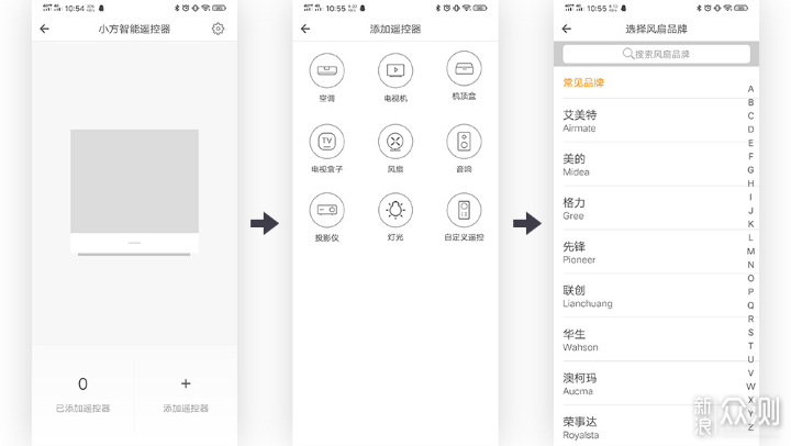遥控器本身只是作为一个中介的功能使用,我们需要通过遥控器添加我们想要控制的电器,只要是可红外控制的家电,都可以通过这款智能遥控器来进行添加,添加只需要通过几个步骤就可以完成,选择需要添加的电器类型,电器品牌即可。