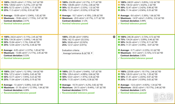 亮度均匀性表现尚可,除了左下角最大亮度亮度偏差较大外,其他区域最大平均偏差都没有超过5% 。