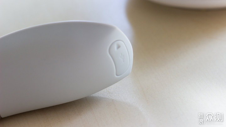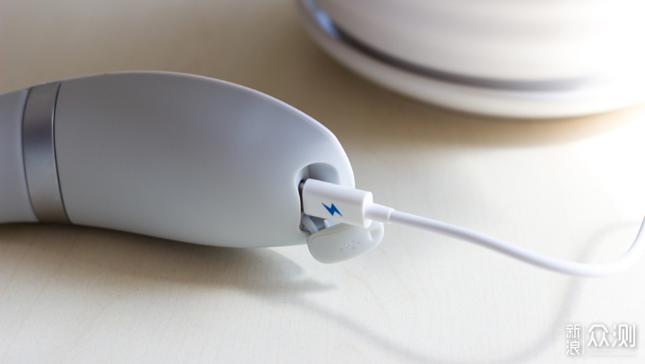 按摩器的顶部为产品的LOGO信息,白色的按摩器配上灰色的文字,也符合大众审美。
