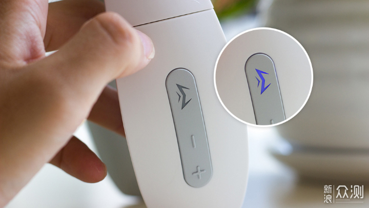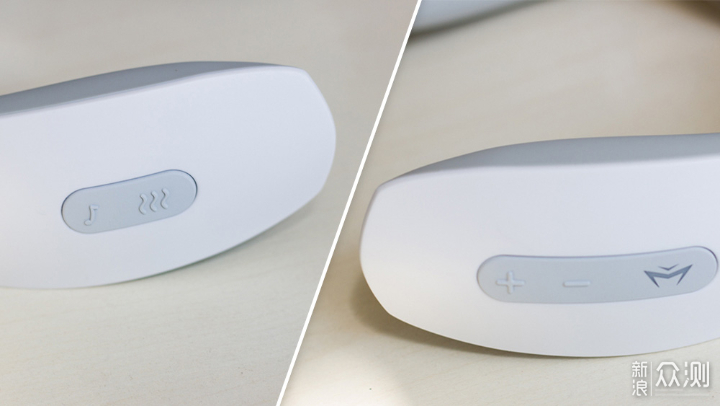 按摩器的左右两个外侧,为这款按摩器的按键设计,分别是音乐/热敷,以及开关键、档位调节键,按键采用了略微凸起的设计,可以让我们很方便的按下。