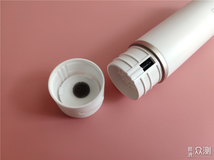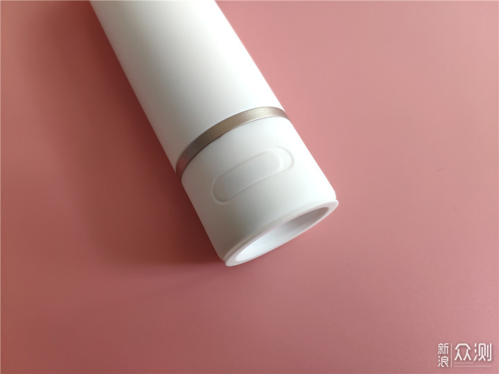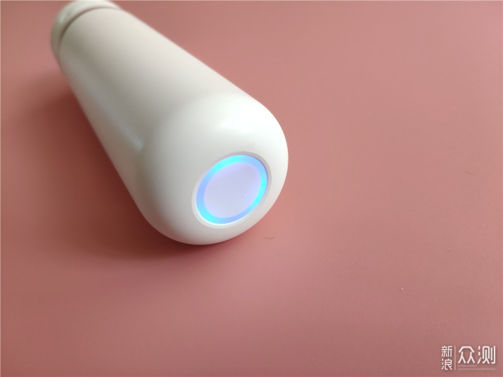 秒秒测倍爱手持真空棒顶部设计了一个电源开关,设计在顶部,能够兼顾操作时的用力方向,有利于底部接口对接和固定。凹面圆形设计,这样可以避免出现误触开关。开关外围一圈还是一个状态指示灯,正常工作时,显示蓝色。