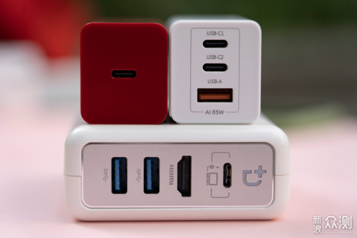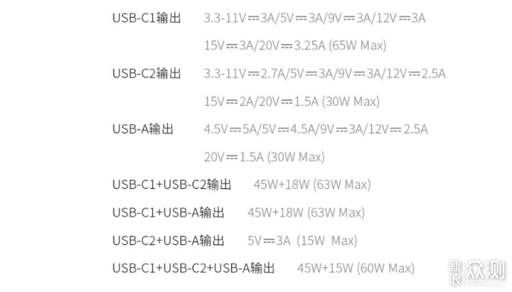 顶部C1最高65w用于给笔记本进行充电;中间C2最高30w用于给iPhone 11等充电(常规手机也可以可以的);底部USB-A最高30w用于常规USB设备充电; 备注:多接口共同组合使用充电效率会有所降低(目前的多口设备都如此) 更多组合效率如下图: