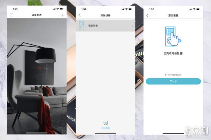 通过扫描用户说明书的二维码即可下载金指码的App,通过右上角的+号,进行智能设备添加,再次我们需要通过REG键开启指纹锁网络设置,输入当前WiFi的密码,进行配网操作。