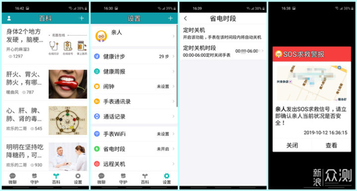 在百科选项中会推送一些健康相关常识。设置选项中汇聚了各种信息和功能设置,例如查看步数,健康周报,设置闹钟,添加手表通讯录,查看通话记录,设置WiFi,省电时段,远程关机,查询手表话费等。在老人长按手表的SOS键后,手表会自动发送短信,拨打电话给管理员,并且App中也会发出实时定位的图片并震动提醒。