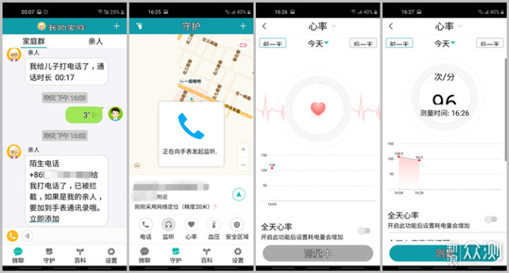 使用手表前需要首先安装SIM卡进行激活,否则无法使用任何功能。在激活手表后,需要按照说明下载专用App“360亲情卫士”,并进行手表绑定。手表的诸多远程功能都需要在App中实现。在App微聊选项中可以直接打电话给手表,同时也能够发送类似微信语音的语音消息,并且能够查看手表的通讯状况,例如打给了谁,接了谁的电话等。需要注意的是手表仅能拨打、接听通过App储存好的号码,例如子女,亲戚、朋友等,但无法自主数字拨号,而陌生号码不仅无法拨号,同时也不能接听,陌生号码打进来会显示手表号码正在通话中,如果是亲朋换号,或是快递来电手表都不会有显示。总在家收快递的老人并不适合。另外手表也不支持收发短信。在守护选项中,可以实时定位老人位置,GPS定位的准确度十分高,可以精确到20米范围,对于有走失可能的老人还是非常适合的。同时在守护选项中还可以进行监听,实时查看心率,血压,以及查看历史轨迹,历史心率等操作。还可以在此设定心率范围,测量心率的频率等。