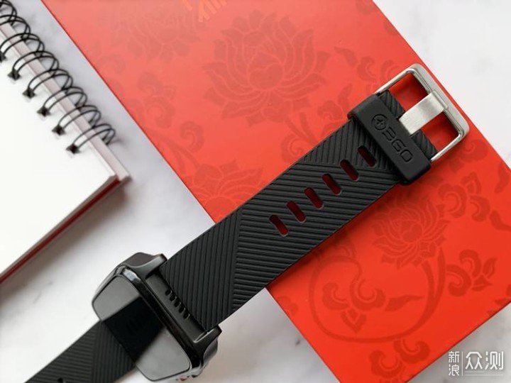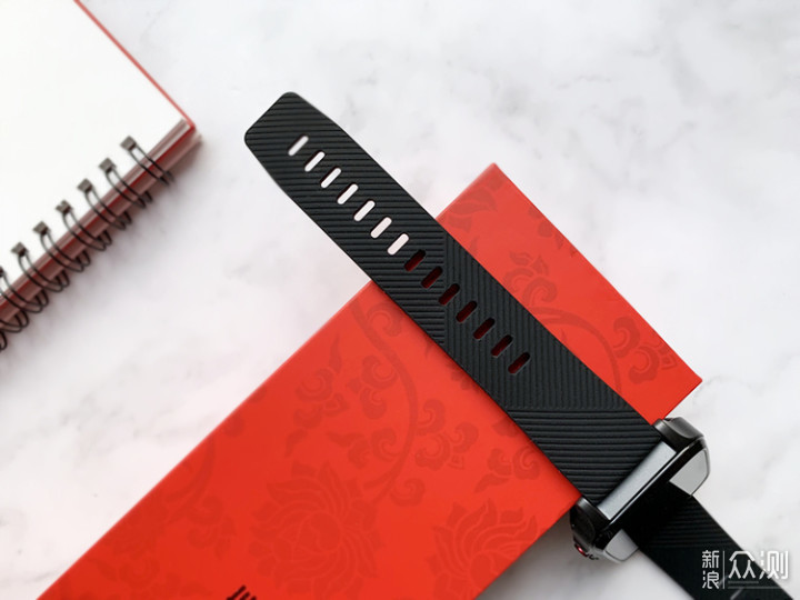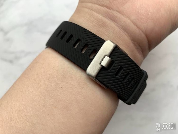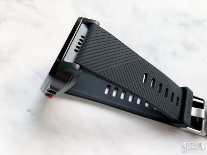 手表采用了硅胶表带,柔软度不错,外侧刻有条状纹理,聊以装饰。表带上设有多个开孔,既能起到锁紧作用,同时也可以更好的排汗散热,多开孔设计适用性很强,无论手腕大小,都能找到适合自己的尺寸。