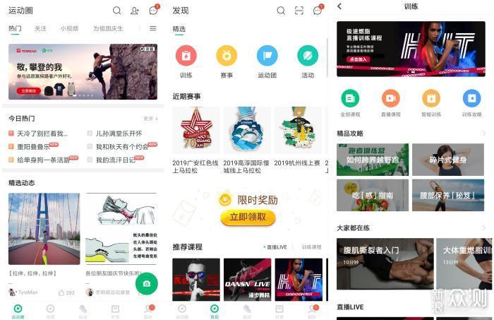 咕咚App功能方面,除了运动数据记录和手表功能设置外,还提供了丰富的社交与健身课程内容。在运动圈板块,用户可以发布运动心得、体会或者是相关经验分享帖,也可以录制各种小视频。而在发现板块,用户可以查找运动训练教程,甚至还提供了佩戴智能装备训练的互动操课,此外发现板块还提供了各种线上线下各种赛事、运动团、同城互动等活动。